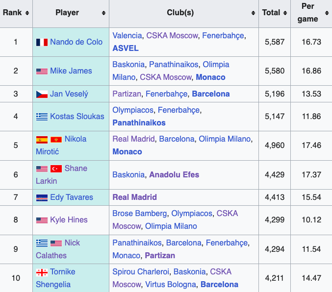 Džejmsu nedostaje sedam indeksnih poena da prestigne De Koloa po ukupnom indeksu u Evroligi. Istina, Nando takođe igra u sjajnom ritmu, najkorisniji je igrač Asvela, tako da bi ta borba sa Džejmsom mogla još malo da potraje, ali činjenica je da Majk igra u sve boljoj formi, ima prosečno 17,8 indeksnih poena u dosadašnjem toku sezone (De Kolo 16,3) i već večeras, protiv Makabija, može da se očekuje promena na vrhu ove liste.