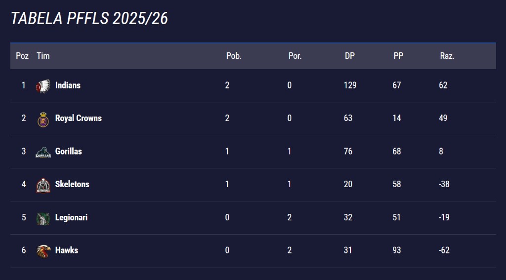 Na otvaranju sezone, Indiansi su briljirali sa čak 129 postignutih poena u dve utakmice, dok su Kraljevčani ostavili utisak najstabilnijeg tima sa samo 14 primljenih poena. Gorillas su pokazali ofanzivnu moć, dok su Skeletonsi i Legionari pružili dobre partije i dokazali da liga nikada nije bila izjednačenija.